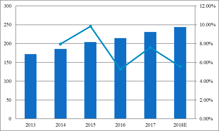 圖:2013-2018年中國收入(百萬美元)和增長率