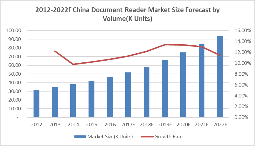 圖:2012-2022F年中國文檔閱讀器市場規(guī)模(按容量(K臺)和增長情況)
