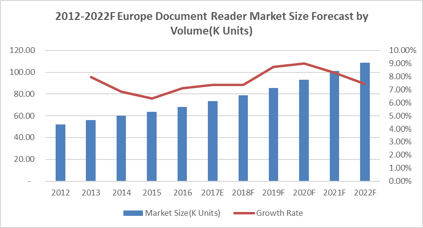 圖:2012-2022F年歐洲文檔閱讀器市場規(guī)模(按容量(K單位)和增長情況)