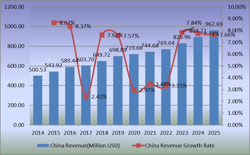 圖:2014-2025年中國廚房刀具收入(百萬美元)和增長率
