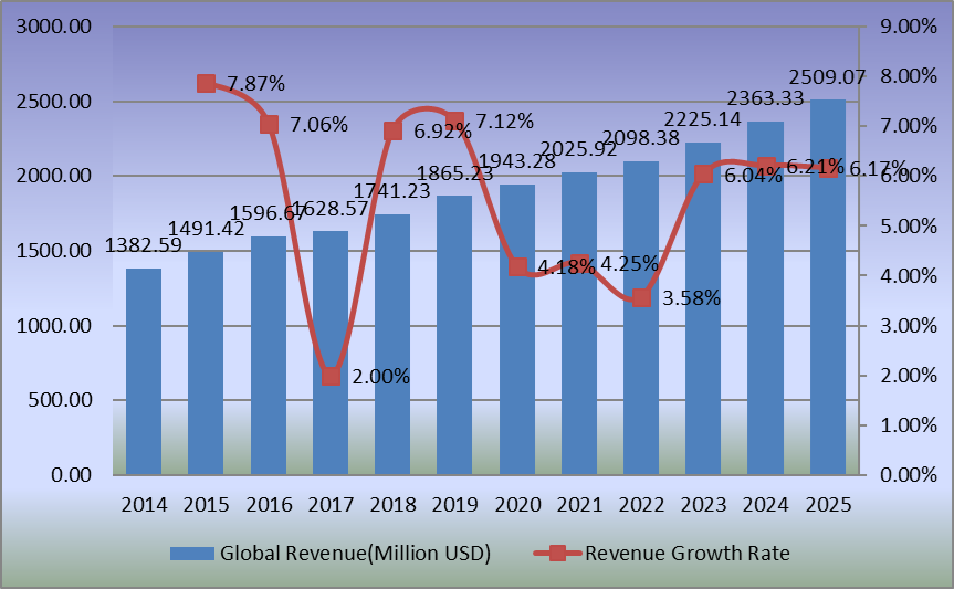 圖:2014-2025年全球廚房刀具收入(百萬美元)和增長率