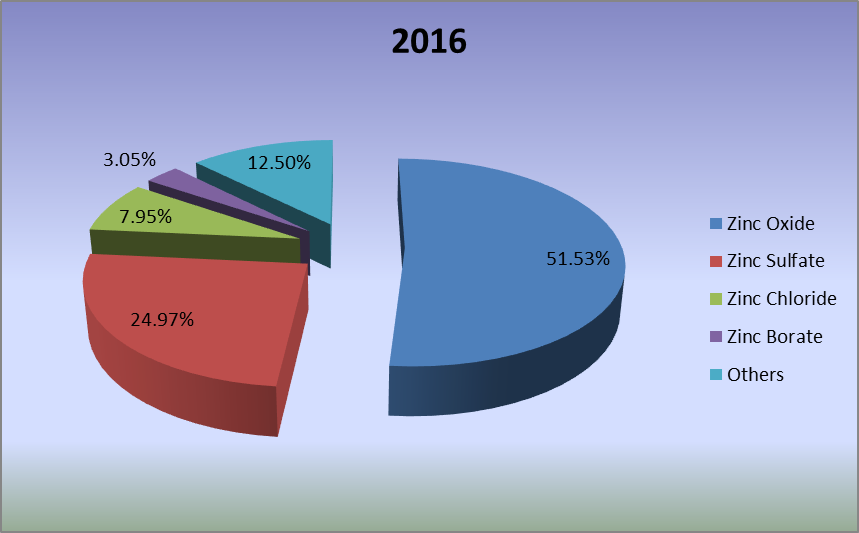 圖:2016年按類型劃分的全球無(wú)機(jī)鋅化學(xué)品市場(chǎng)份額(%)