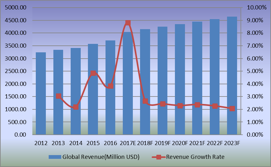 圖:2012-2023年全球無(wú)機(jī)鋅化學(xué)品收入(百萬(wàn)美元)和增長(zhǎng)率