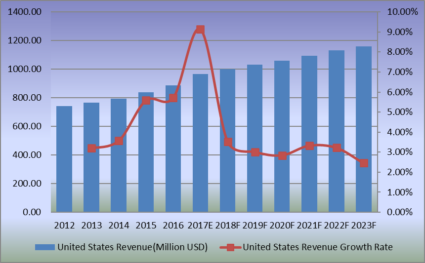 12.2.1美國(guó)無(wú)機(jī)鋅產(chǎn)量(MT)和收入(百萬(wàn)美元)預(yù)測(cè)(2018-2023年)