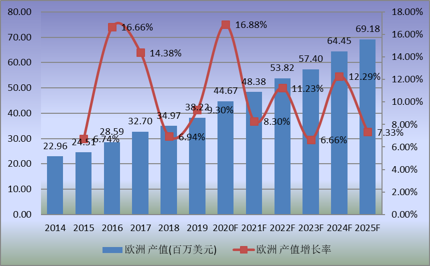 圖::歐洲市場固體氧化物燃料電池(SOFC)2014-2025年產(chǎn)值及增長率