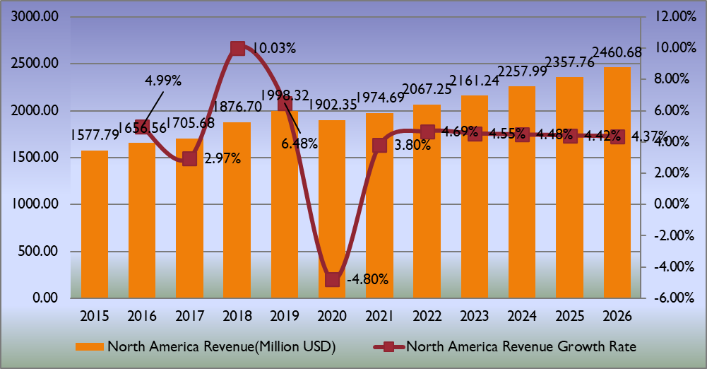 圖:北美基于PC的示波器產(chǎn)值(百萬美元)和增長率(2015-2026年)