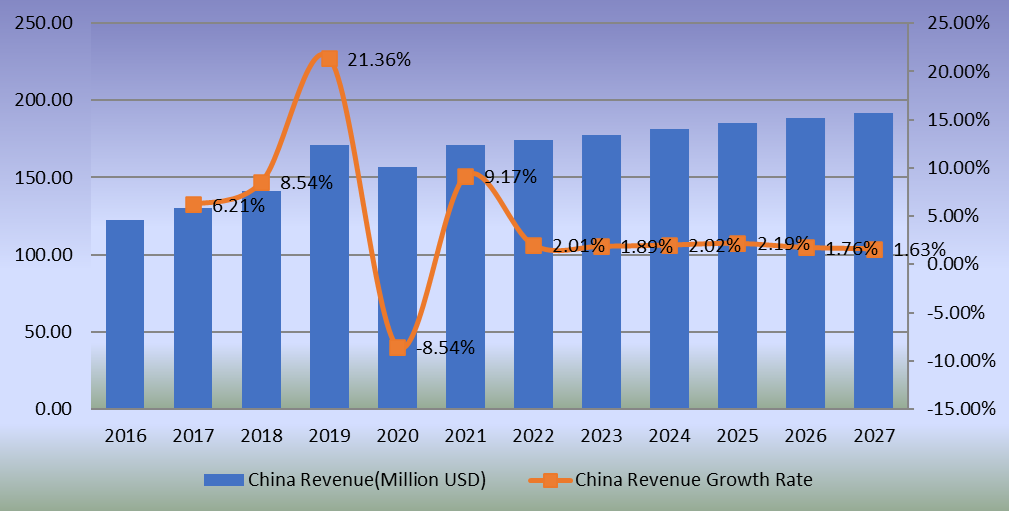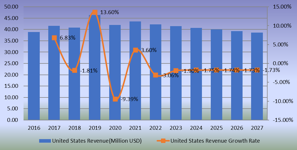 圖:歐洲異噻唑啉酮生物殺滅劑收入(百萬美元)和增長率(2016-2027年)
