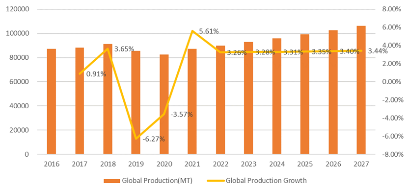 圖:2016-2027年全球異噻唑啉酮?dú)⑸飫┊a(chǎn)量和增長率