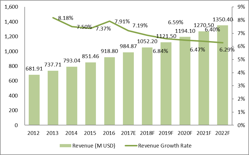 9.13.3克朗斯托盤輸送機收入(百萬美元)和毛利率(%)(2012-2017年)