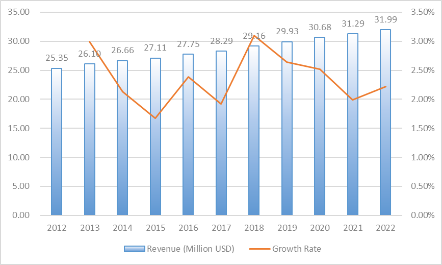 圖:2012-2022年全球LiNbO3晶體收入(百萬(wàn)美元)和增長(zhǎng)率