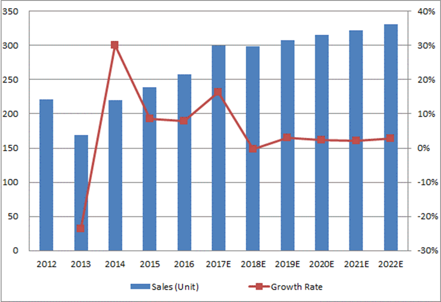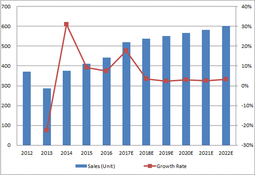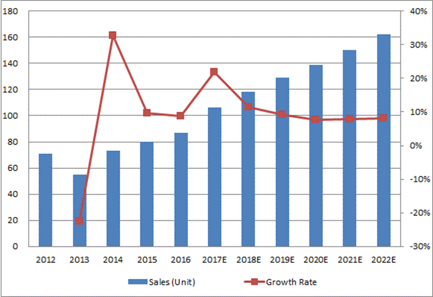 12.1.1全球倒裝芯片鍵合器產(chǎn)量(單位)和增長率(%)預(yù)測(2017-2022年)
