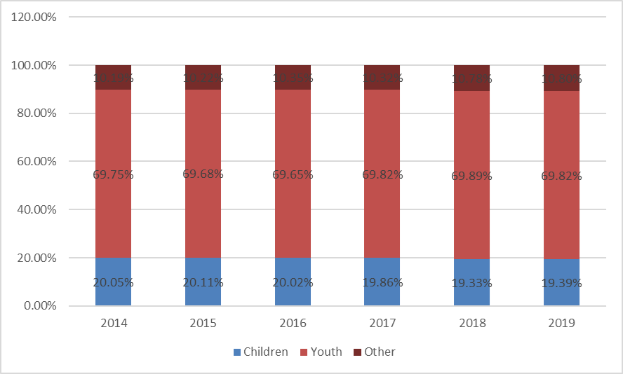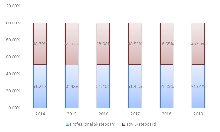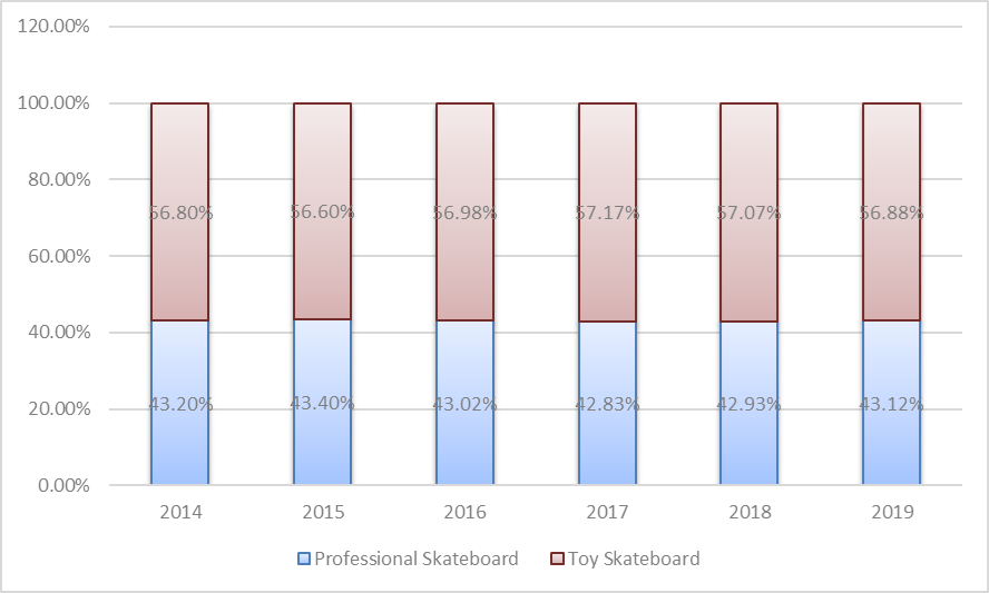 4.據市場調研數(shù)據顯示,從2014年到2019年,玩具滑板在過去六年中在全球市場保持了66%到73%的增長趨勢;青年人約占70%的市場份額。