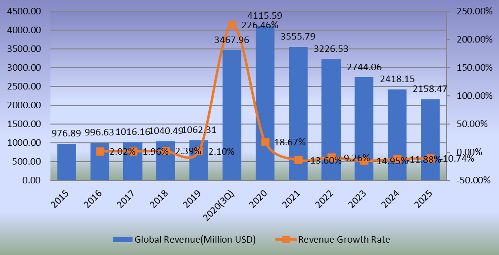 圖:2014-2025年全球耐油涂層收入(百萬美元)和增長率
