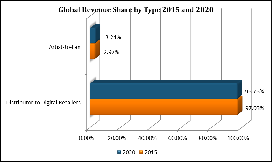 就類型而言,分銷商到數(shù)字零售商占據(jù)了最大的市場份額,即2019年收入的96.81%。2019年,數(shù)字零售商音樂分銷服務市場的分銷商價值為8.9456億美元,預計2026年將達到12.0716億美元,2020-2026年預測期內(nèi)的復合年增長率為4.39%。